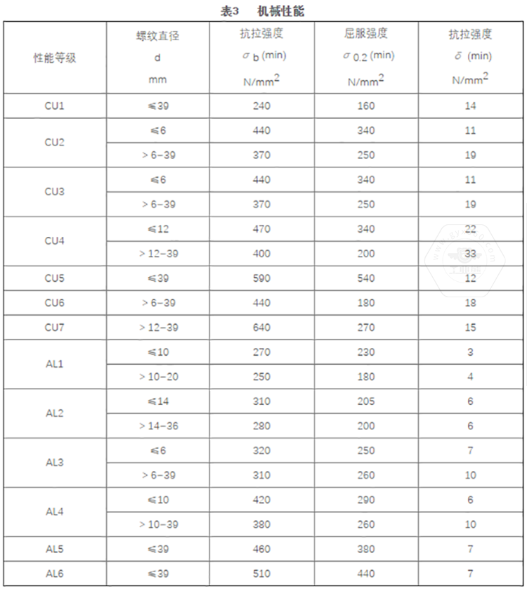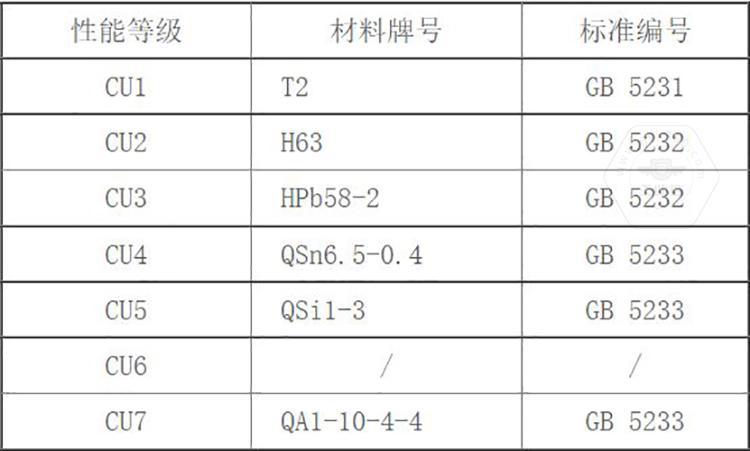 GB/T 3098.10標準中將銅制緊固件分為7個性能等級,標記代號由字母及數(shù)字兩部分組成,即有色金屬化學(xué)元素字母加數(shù)字。其性能等級為CU1、CU2、CU3、CU4、CU5、CU6、CU7。標準中同時推薦了對應(yīng)性能等級選用的銅材料牌號。