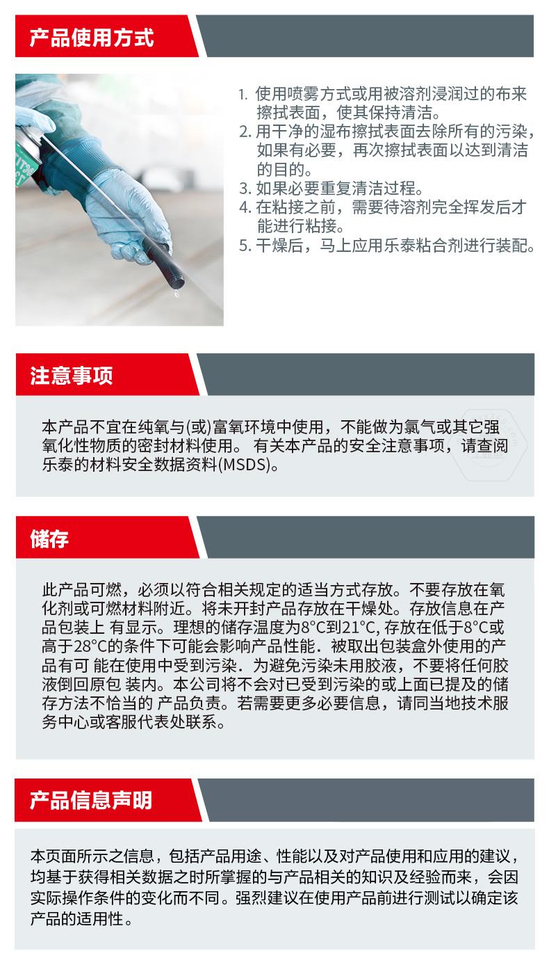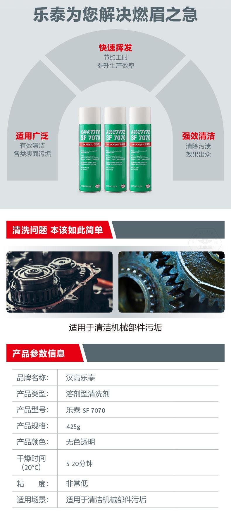 樂泰SF7070是一款溶劑型清洗劑。樂泰SF7070主打快速去污,適用于表面清潔和機械部件污垢清洗。樂泰SF7070無色透明,化學類型為碳氫化合物,20℃下干燥時間為5-20分鐘,粘度非常低。樂泰SF7070具備快速揮發(fā)、應用廣泛、強效清潔等特點,可用于裝配前的最終清潔處理。樂泰SF7070還與金屬、多種塑料和彈性體兼容。